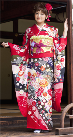 Furisode – 振袖 : de couleurs vives, ce kimono de cérémonie aux manches longues est porté par les jeunes femmes célibataires. C’est ce genre de kimonos que l’on porte lors du Seijin no Hi, la fête de la majorité.